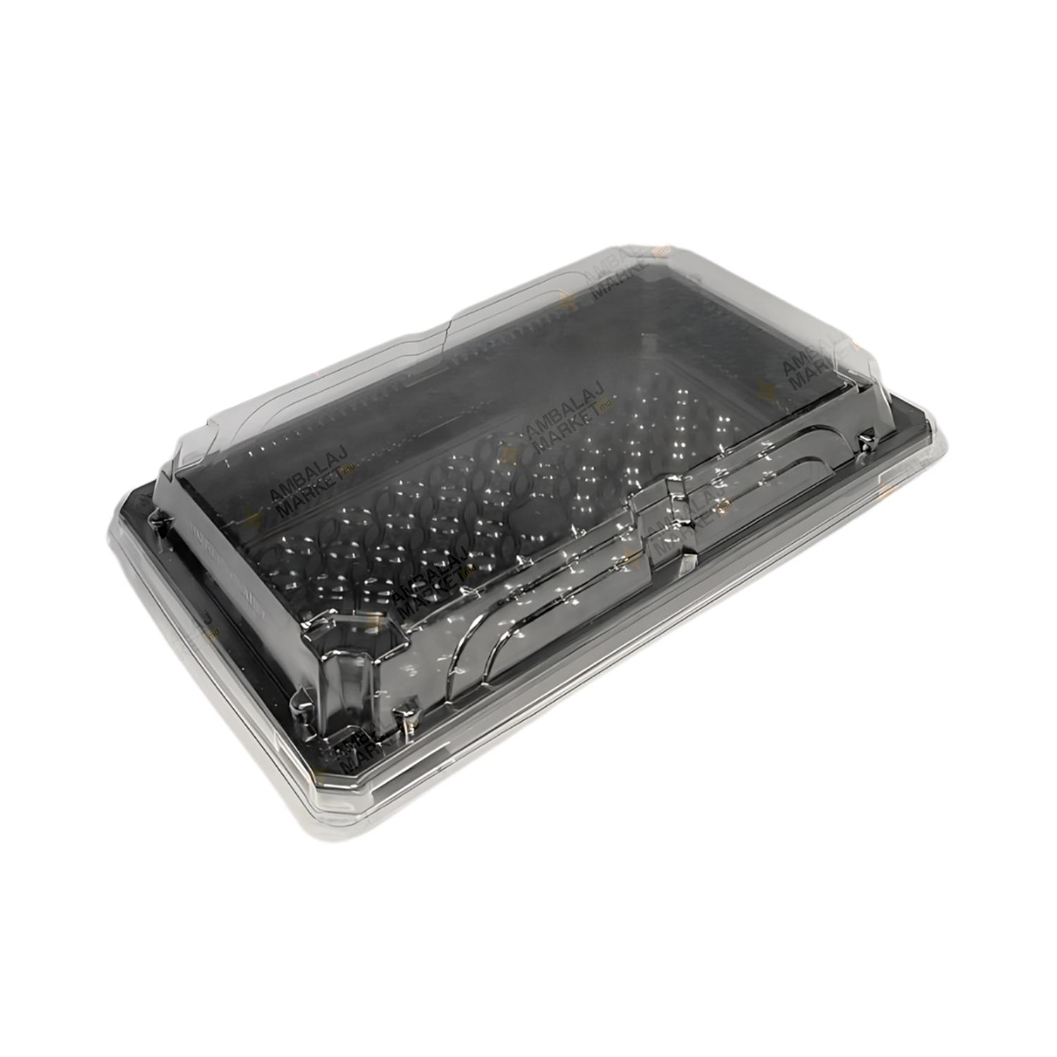 Caserolă PET pentru sushi L 190×110×40 mm cu fund negru – ambalaj alimentar modern, realizat din plastic PET transparent cu bază neagră elegantă. Capac etanș ce protejează produsul și permite vizualizarea conținutului. Recomandată pentru sushi, rulouri, deserturi sau preparate ready-to-go.