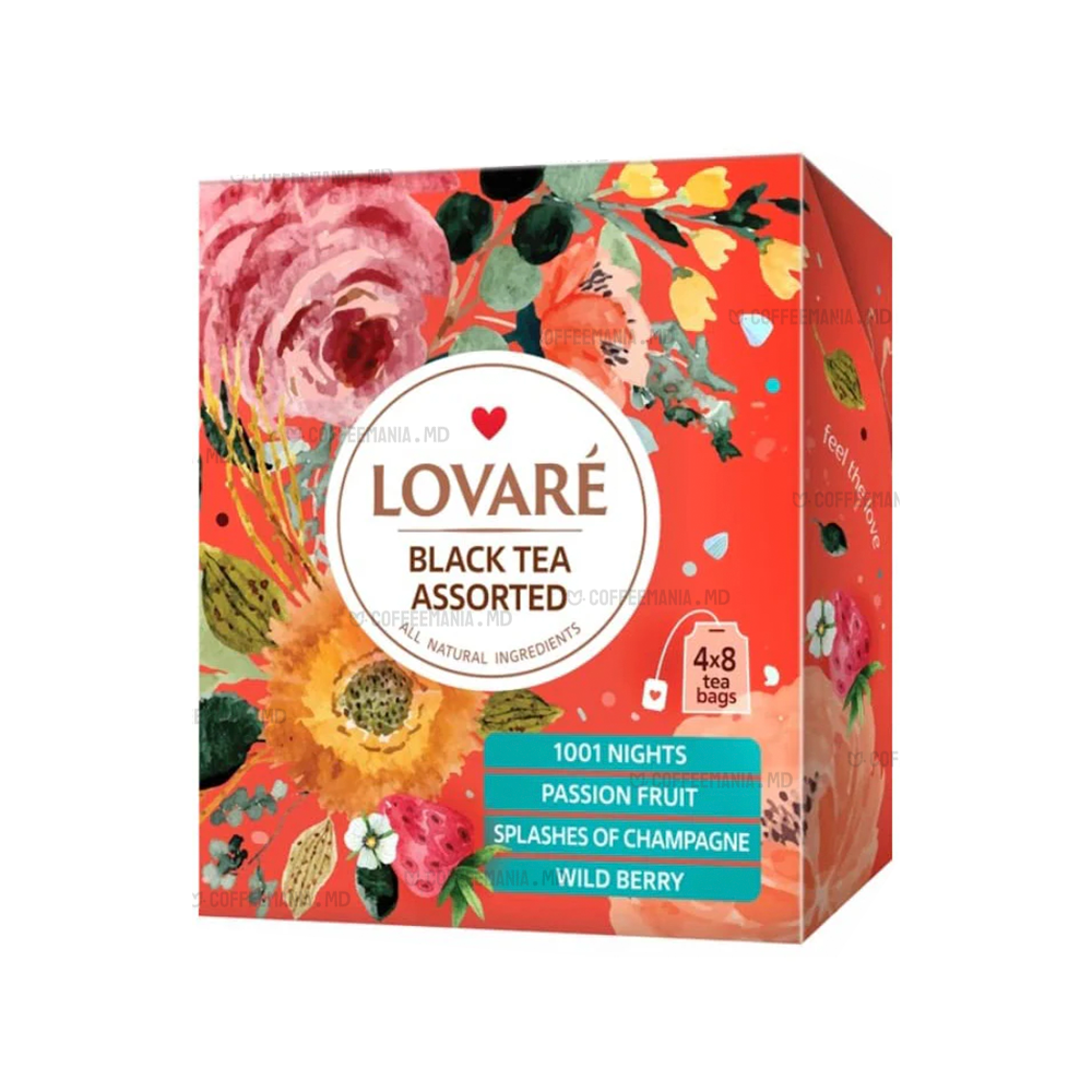 Lovare Black Assorti (4×8) — selecție elegantă de patru arome distincte în ceai negru, fiecare cu propriul caracter și notă grată. Fiecare plic conține ceai negru de calitate (Ceylon) sau amestec negru + verde, împreună cu fructe, petale florale și arome naturale. Sortimentul este ideal pentru cei care doresc varietate într-un singur pachet.