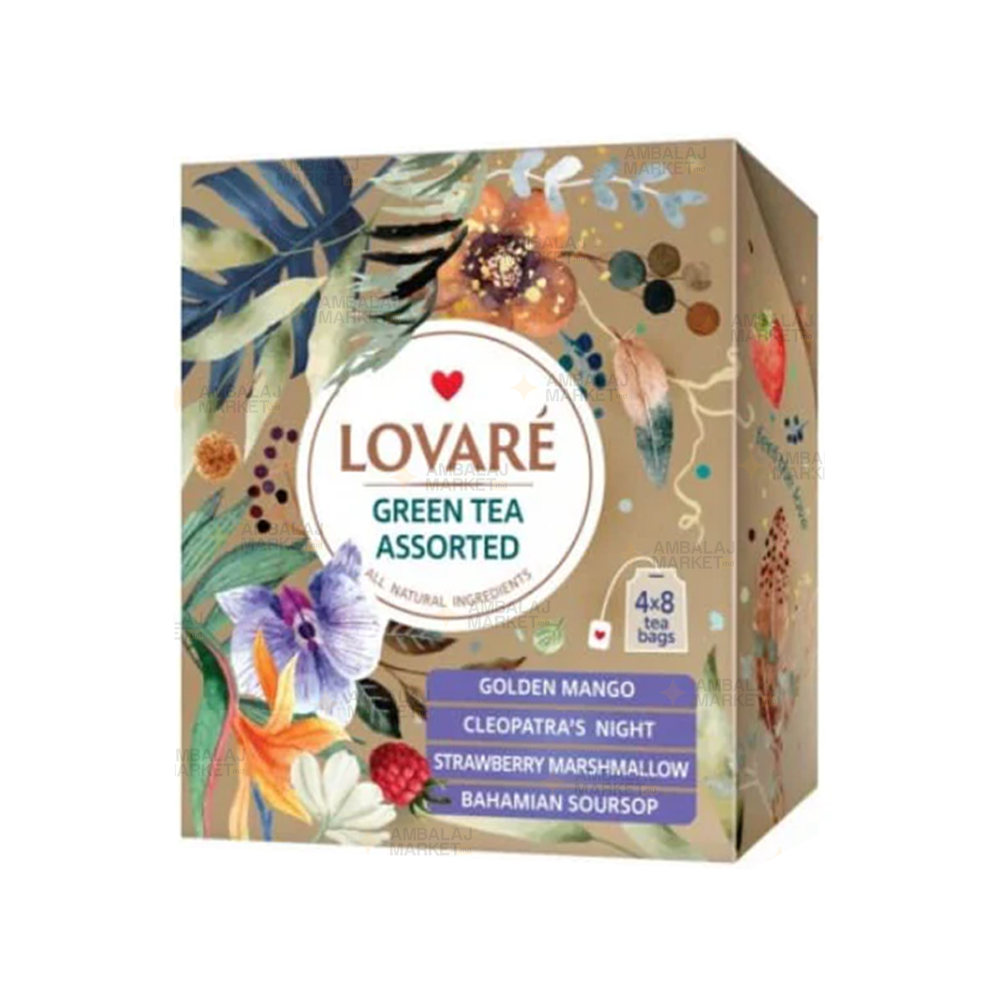 Lovare Green Assorti — selecție elegantă de patru varietăți de ceai verde aromatizat, livrată în 32 de plicuri individuale (8 plicuri pentru fiecare aromă). Aceste variații combină ceai verde de calitate cu note delicate de fructe, flori și ingrediente exotice.