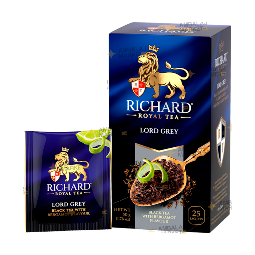 RICHARD Lord Grey (25 plicuri) — ceai negru aromatizat delicat, cu bază de frunze de ceai Ceylon şi o nuanţă rafinată de bergamotă şi coajă de lămâie.