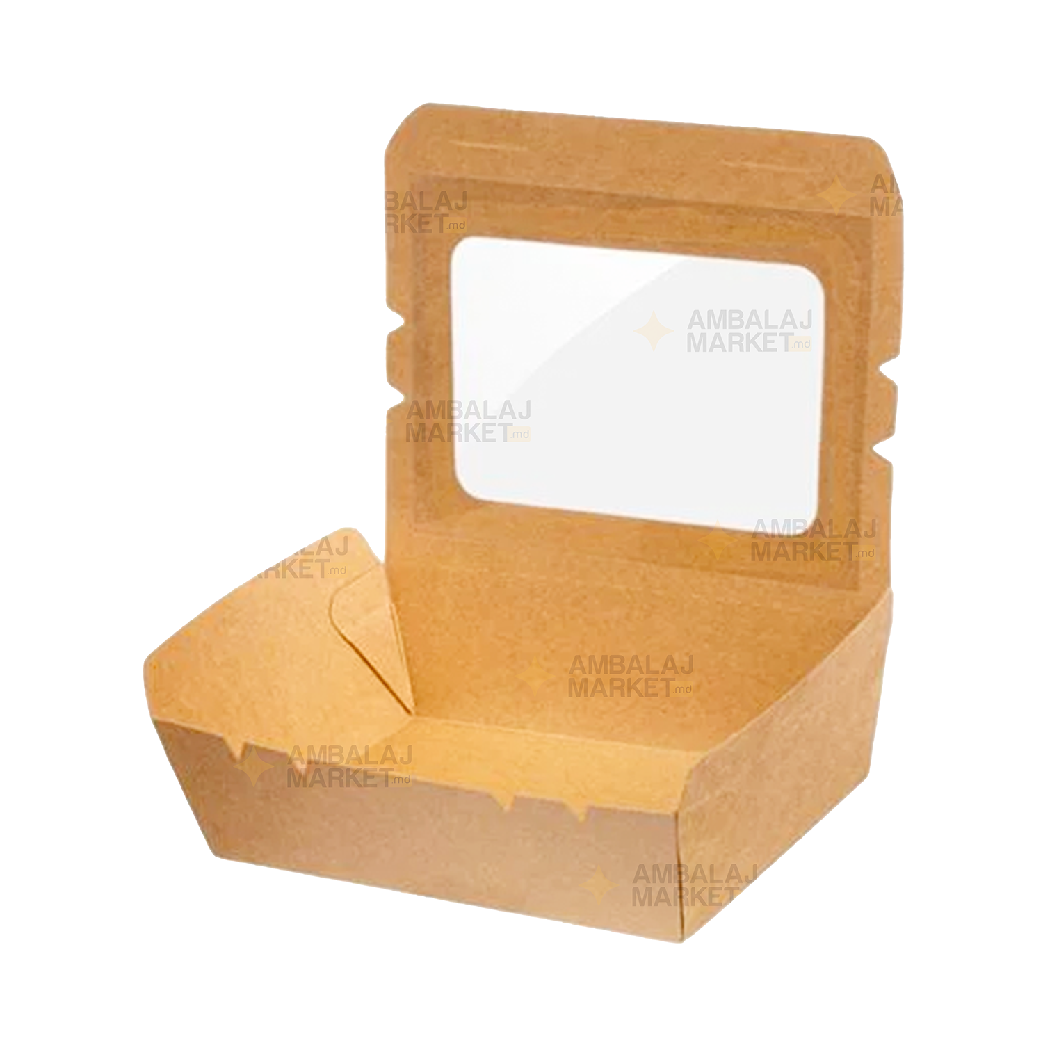 Cutie alimentară kraft cu fereastră PET 700 ml (15×10×4.5 cm) – ambalaj modern și practic din carton kraft cu fereastră transparentă PET, ideal pentru servirea preparatelor la pachet. Permite expunerea produselor fără a fi nevoie de deschiderea cutiei. Potrivit pentru alimente calde (max. 80 °C) și congelate (–18 °C).