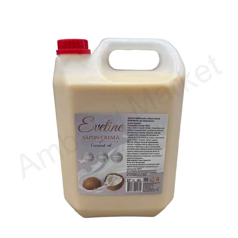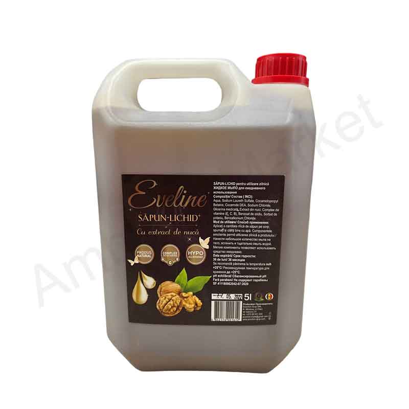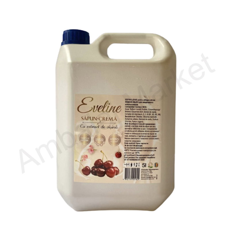 - Săpun lichid Eveline 5L - aromele bogate de nucă, vișină și cocos pentru o experiență olfactivă deosebită