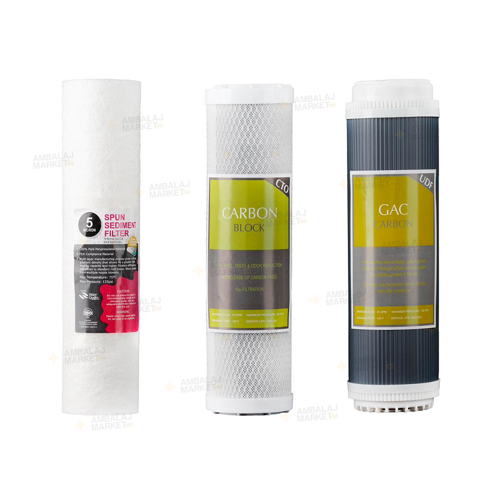 Setul de 3 cartușe pentru filtru de apă asigură o filtrare etapizată, eliminând sedimentele, clorul și impuritățile organice. Ideal pentru menținerea performanței sistemelor de filtrare și obținerea unei ape curate și sigure pentru consum.